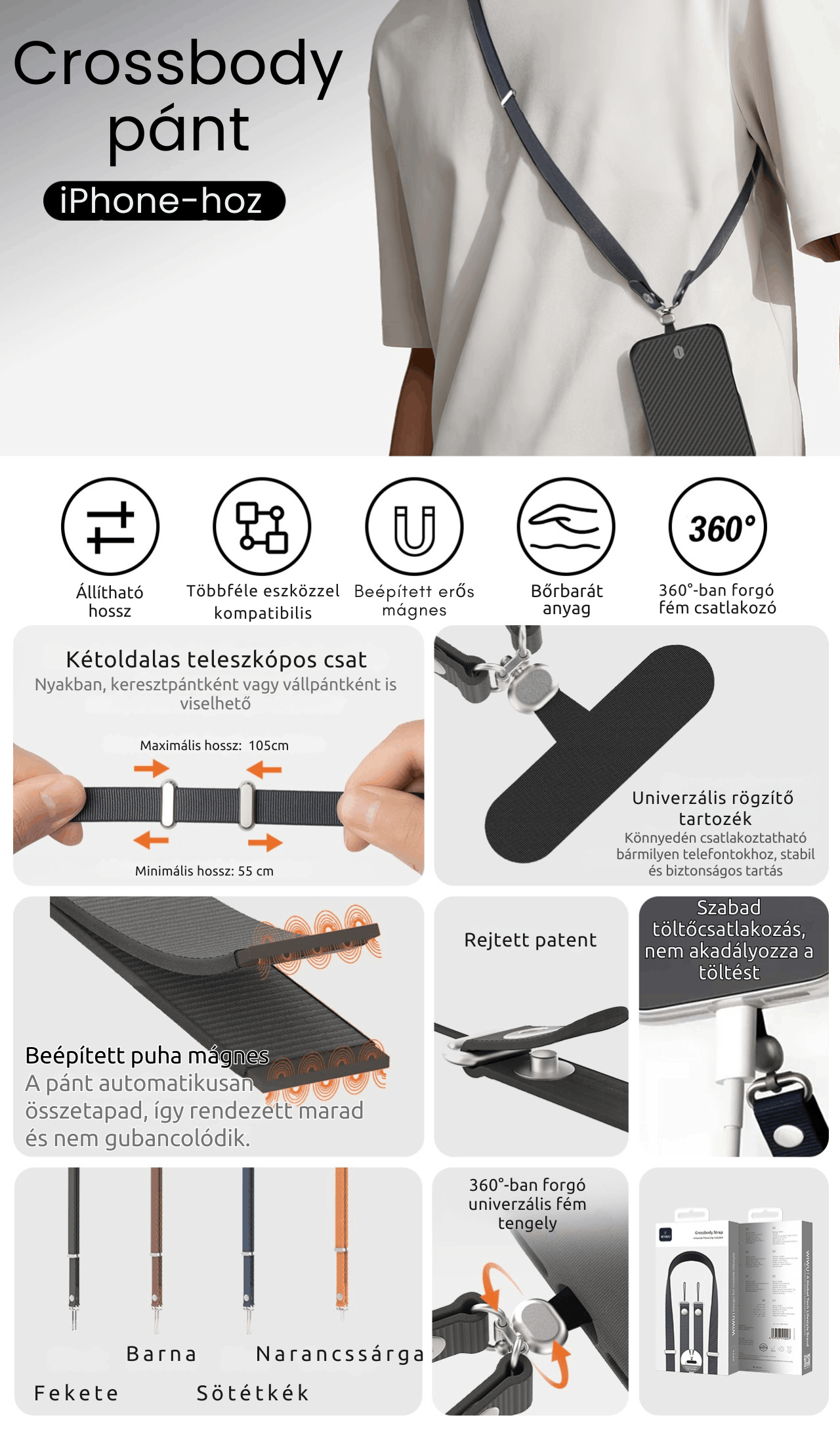 Crossbody telefontartó pánt – állítható, mágneses, univerzális (fekete)