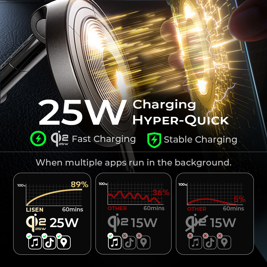 A LISEN MagDrive Qi2.2 Pro 25W egy prémium kialakítású, mágneses autós telefontartó és vezeték nélküli töltő, amely a legújabb Qi2.2 szabványt használja. Stabil rögzítést, nagyfokú állíthatóságot és gyors, biztonságos töltést biztosít vezetés közben. Ideális választás mindennapi használatra, navigációhoz és hosszabb utazásokhoz egyaránt.