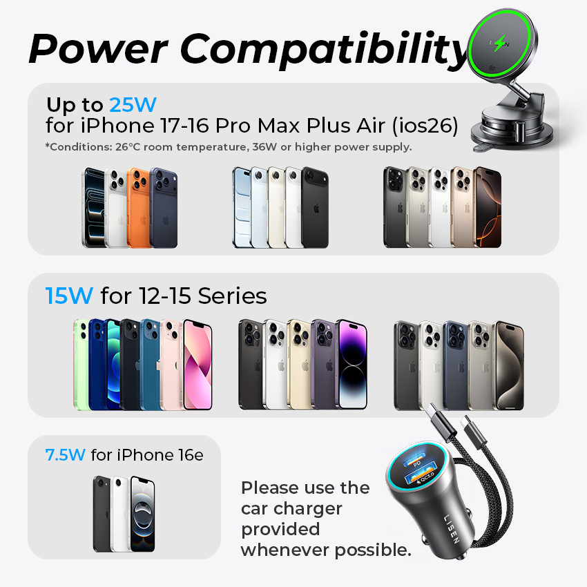 • iPhone 17, 16, 15, 14, 13 és 12 széria (modellfüggő töltési teljesítménnyel)