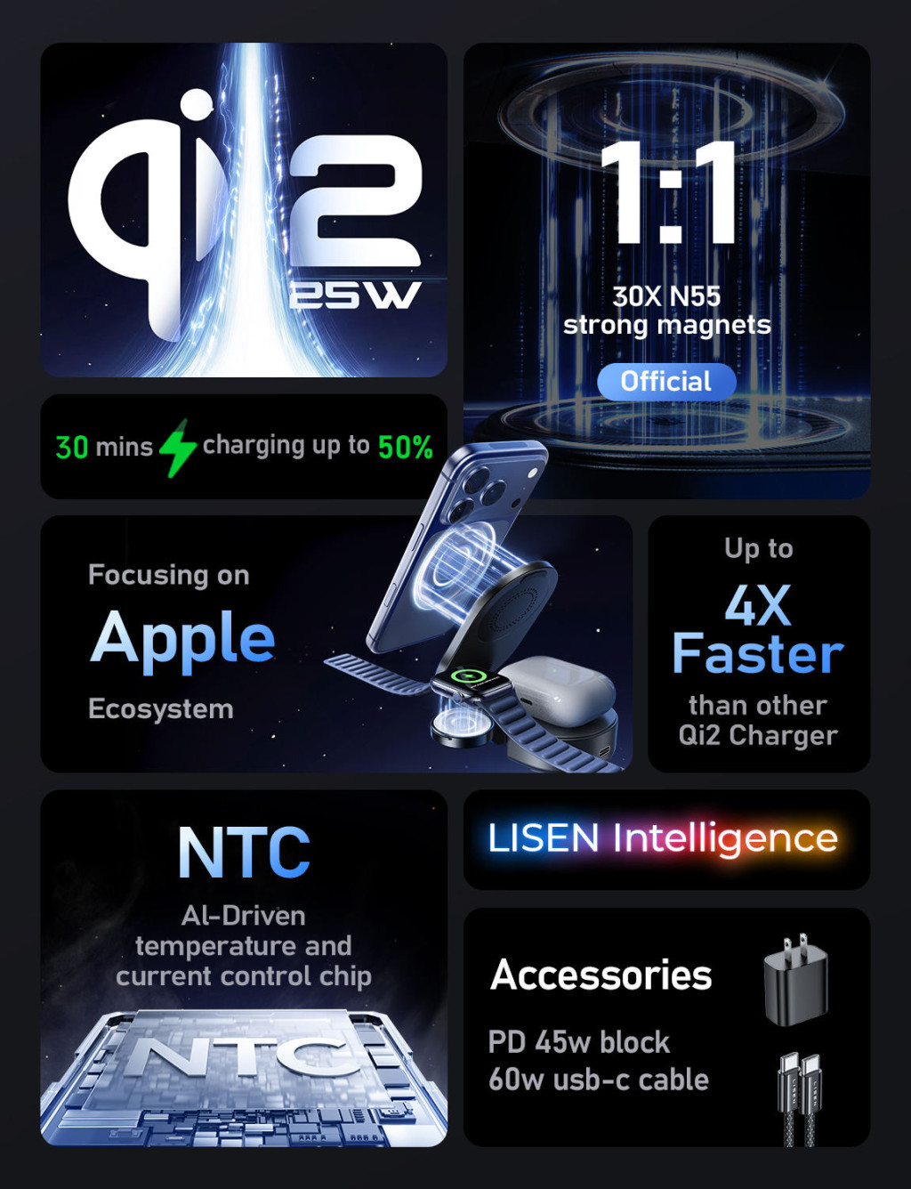 • Akár 2× gyorsabb, mint a hagyományos 15W-os Qi2 töltők