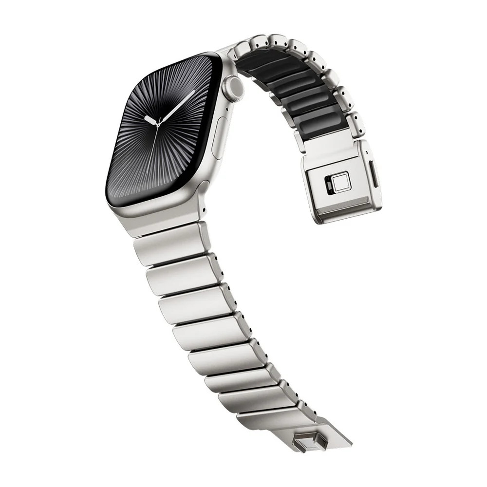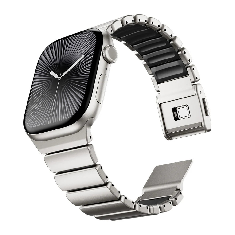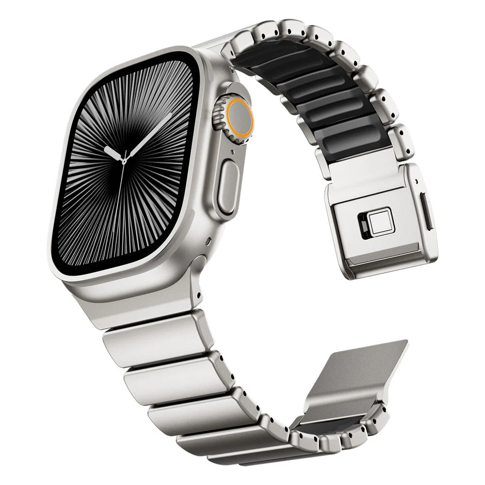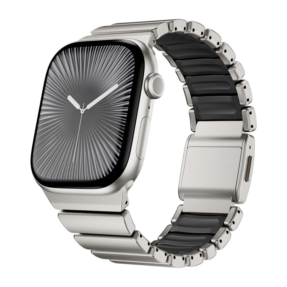 Prémium rozsdamentes acél és rugalmas szilikon kombinációjával készült sportos-elegáns Apple Watch szíj. A kényelmes, légáteresztő kialakítás és a nagy szakítószilárdságú betétek biztosítják a tartós, egész napos viseletet. A neodímium mágneses zárral gyorsan és biztonságosan rögzíthető, egy kézzel is könnyedén kezelhető. A moduláris szerkezet lehetővé teszi a méret egyszerű állítását, így tökéletesen illeszthető a csuklóra. Ideális választás mindennapi viseléshez, edzéshez és elegáns megjelenéshez egyaránt.
